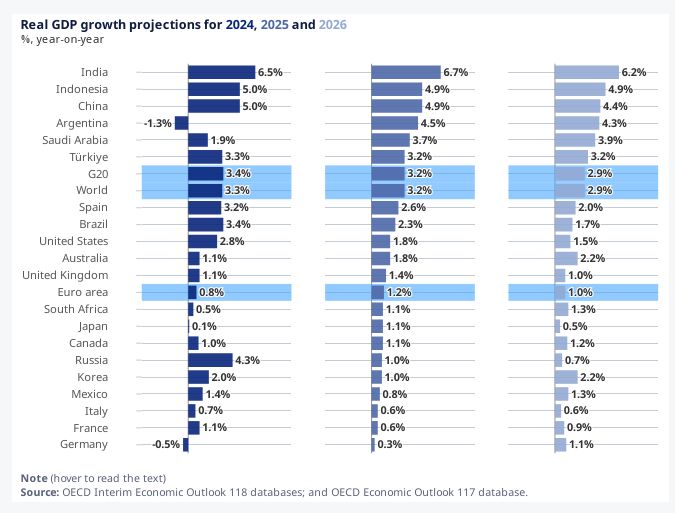 ورفعت منظمة التعاون الاقتصادي والتنمية توقعات النمو الاقتصادي العالمي إلى 3.2% عن العام 2025م، مقابل توقعات النمو السابقة عند 2.9%.