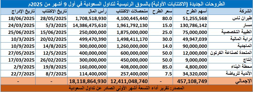 مباشر - السيد جمال: ارتفعت حصيلة الطروحات الجديدة (الاكتتابات الأولية) في السوق الرئيسية لتداول السعودية خلال أول 9 أشهر من عام 2025م على أساس سنوي؛ بدعم من طرح شركات هامة بالسوق من أبرزها "طيران ناس" كأول شركة طيران مدرجة في سوق الأسهم السعودية، بالإضافة إلى شركة أم القرى للتنمية والإعمار "مسار"، المالك والمطور لمشروع وجهة مسار في مكة المكرمة.