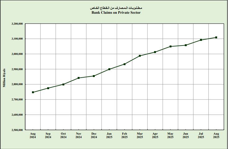 ووصل حجم مطلوبات المصارف من القطاع الخاص بالمملكة إلى 3.109 تريليون ريال بنهاية شهر أغسطس/ آب 2025م؛ وهو أعلى مستوى تاريخي يصل إليه على الإطلاق، فيما كان يبلغ 2.747 تريليون ريال بنهاية الشهر ذاته من العام الماضي.