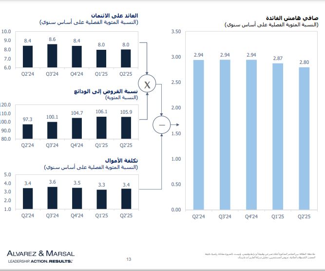 وفي حين تراجع صافي هامش الفائدة بمقدار 8 نقاط أساس ليصل إلى 2.80% بسبب ارتفاع تكاليف التمويل، أظهرت البنوك مرونةً كبيرة عبر الإدارة الفعالة للتكاليف، فتحسّنت نسبة التكلفة إلى الدخل الإجمالية بمقدار 30 نقطة أساس لتصل إلى 29.5%، حيث أبلغت 8 من أصل 10 بنوك عن تحقيق مستويات أعلى من الكفاءة.