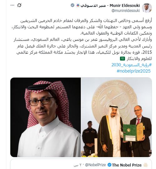 وحصل العالم السعودي عمر مؤنس ياغي على جائزة نوبل في الكيمياء؛ تقديرًا لإسهاماته الريادية في تأسيس علم الكيمياء الشبكية، وتطوير الأطر المعدنية العضوية، والأطر العضوية التساهمية، التي أحدثت ثورة في علوم المواد وفتحت آفاقًا جديدة لتطبيقات الطاقة النظيفة والمياه والبيئة، وفقا لوكالة الأنباء السعودية "واس".