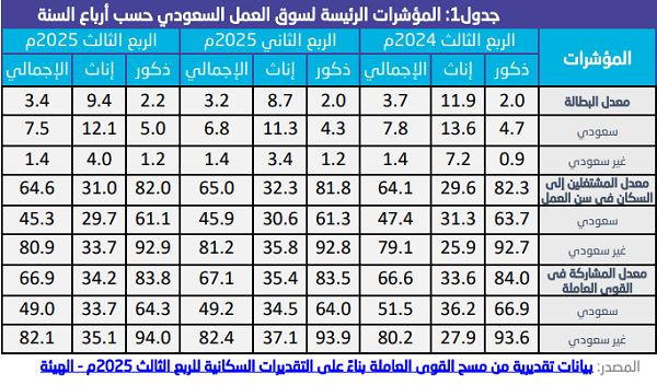 وأظهرت النتائج ارتفاع معدل مشاركة السعوديين في القوى العاملة في الربع الثالث لعام 2025م بنسبة 0.2% مقارنةً بالربع الثاني من نفس العام، ليصل إلى 49% مسجلا انخفاضا سنويا بمقدار 2.5% مقارنةً بالربع الثالث من عام 2024م.