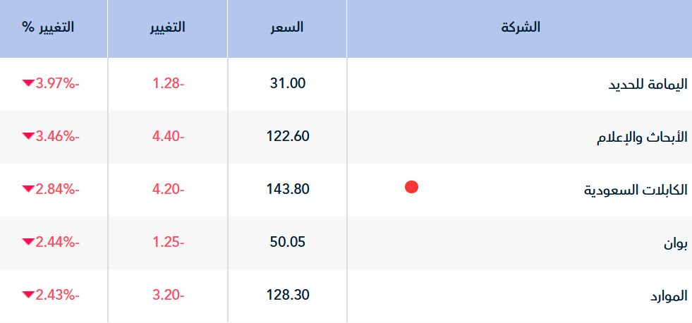 وفي المقابل تراجع أداء 74 سهما، في مقدمتهم سهم "اليمامة للحديد" بنسبة تراجع قدرها 4.15% ، كما تراجع أداء سهم الأبحاث والإعلام بنسبة 3.54%.