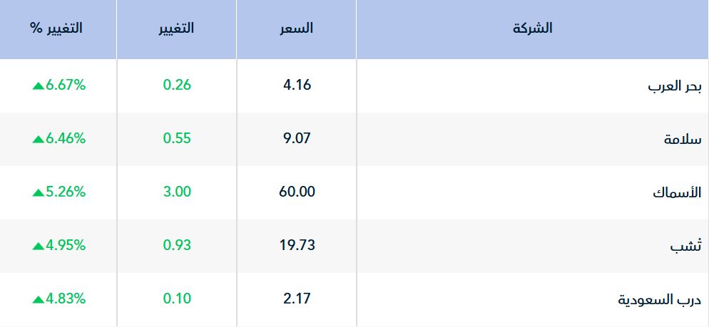 وعلى مستوى الأسهم ، شهد 180 سهماً أداءً إيجابيا، تصدرهم " بحر العرب" الذي ارتفع بنسبة 6.92%، تلاه سهم "سلامة" بارتفاع نسبته 6.46%.