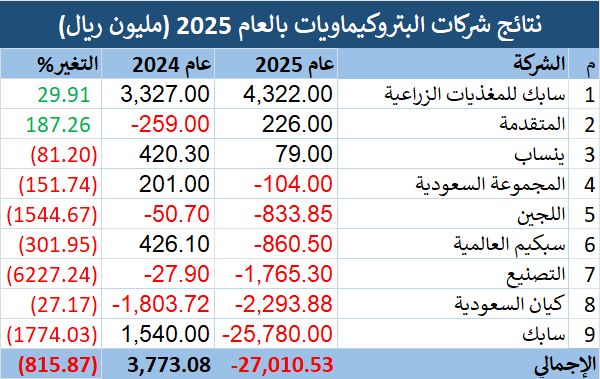 وتكبدت الشركة السعودية للصناعات الأساسية "سابك"، صافي خسارة بلغ 25.78 مليار ريال، بالعام 2025، مقابل صافي ربح بلغ 1.54 مليار ريال في عام 2024، لتضغط على نتائج شركات البتروكيماويات.