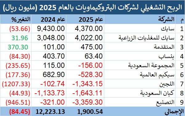 واحتلت شركة سابك للمغذيات الزراعية المركز الثاني، بأرباح تشغيلية بلغت 4.02 مليار ريال، في عام 2025، مقابل 3.05 مليار ريال بالعام السابق، بارتفاع نسبته 31.96%.