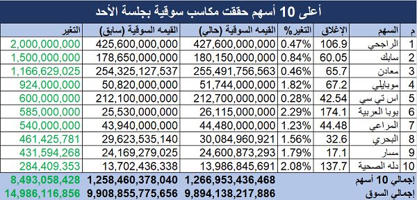 "الراجحي" يقود الأسهم المدرجة بـ"تداول" لمكاسب سوقية 8.49 مليار ريال بجلسة الأحد, اليوم الأحد 5 أبريل 2026 06:34 مساءً