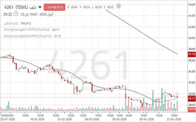 سهم "ذيب" يتحرك في اتجاه هابط رئيسي مع استمرار الضغوط البيعية, اليوم الخميس 23 أبريل 2026 02:26 مساءً