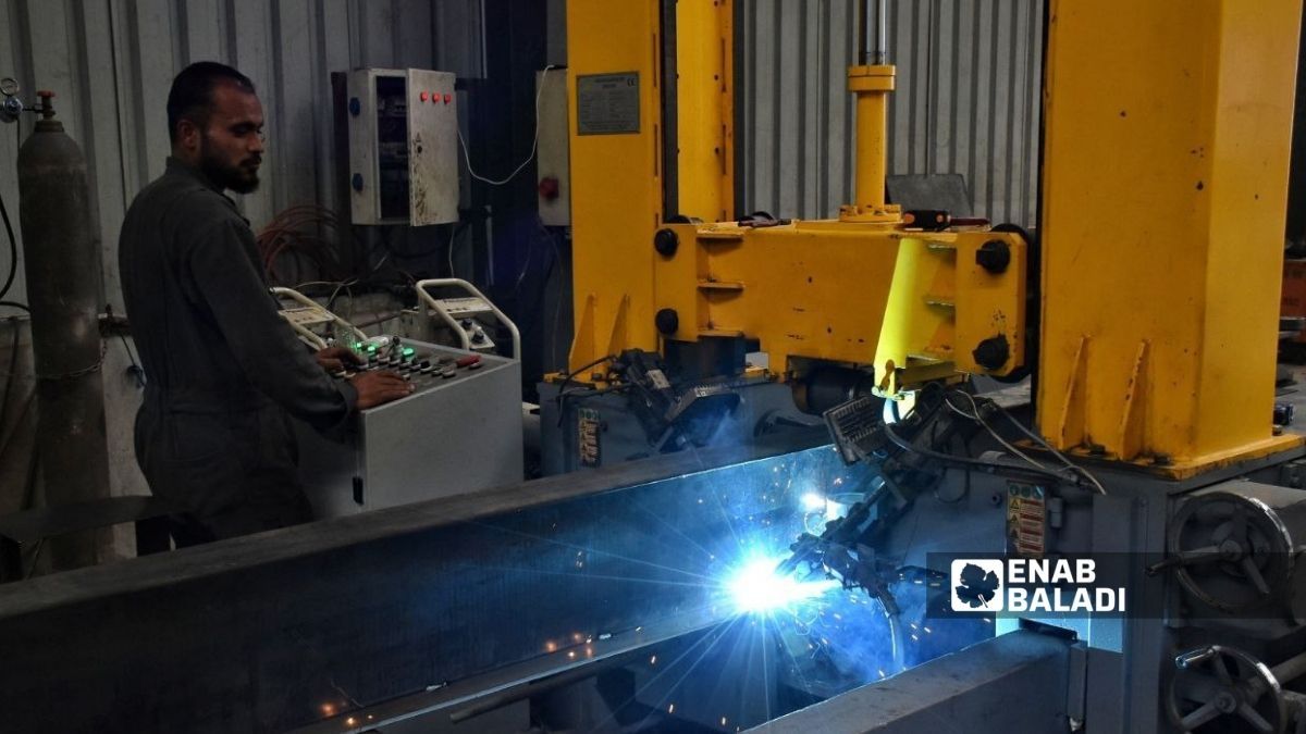 عامل يشغل آلة للحام الحديد في معمل للحديد بمنطقة العرقوب الصناعية بمدينة حلب- 2 تشرين الثاني 2025 (عنب بلدي)