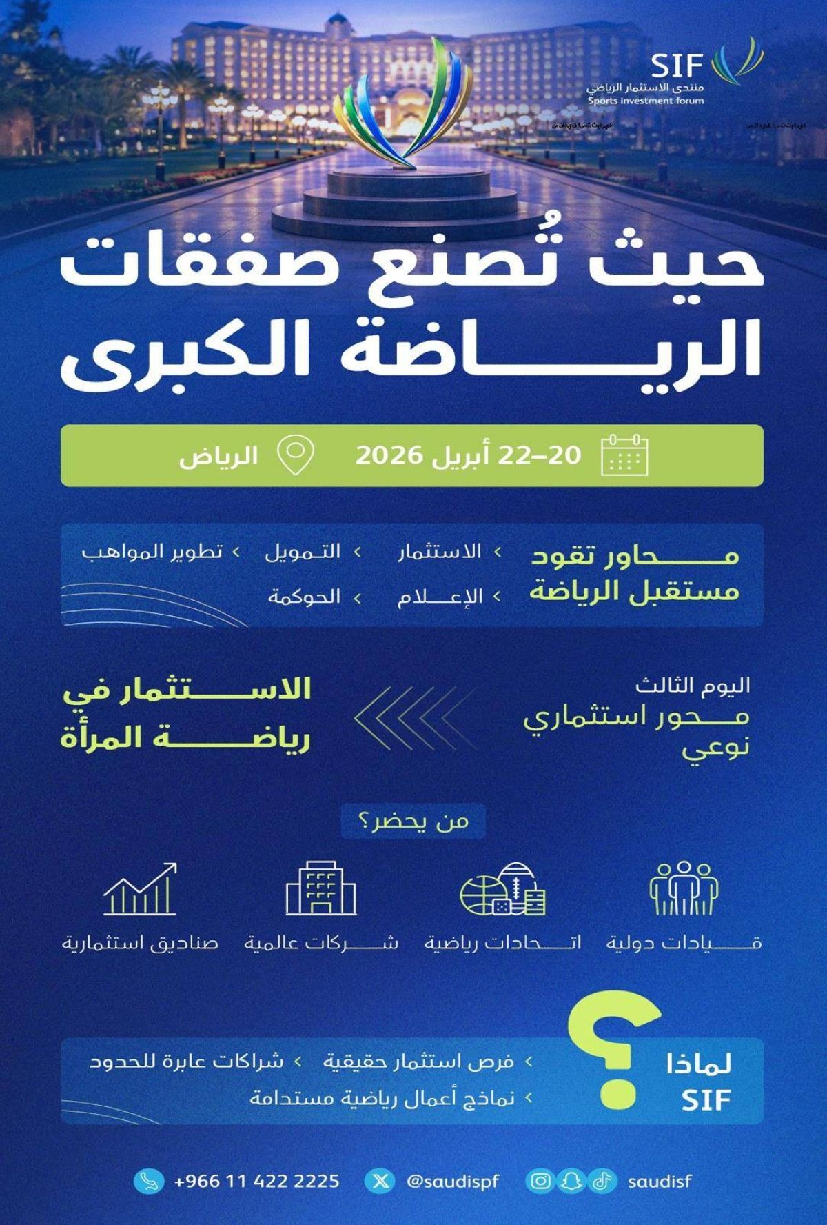 أعلن منتدى الاستثمار الرياضي (SIF) في نسخته المقبلة، التي ستقام خلال الفترة (20 حتى 22 أبريل) 2026 في مدينة الرياض، عن تخصيص يومه الثالث عن الاستثمار في رياضة المرأة مؤكدا ترسيخ مكانته كمنصة دولية رائدة تجمع بين الرياضة، الاستثمار، والتنمية الاقتصادية على المستويين الإقليمي والعالمي.