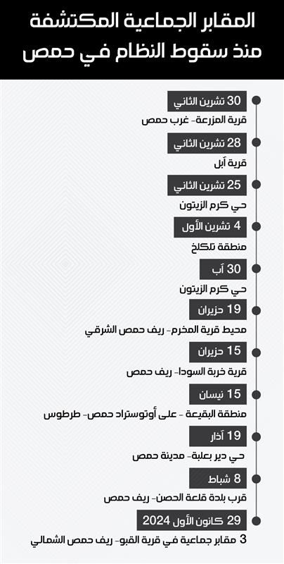 تكررت خلال الأشهر الأخيرة إعلانات العثور على مقابر جماعية في أحياء وقرى متفرقة من المحافظة، من كرم الزيتون ودير بعلبة داخل المدينة، إلى المخرم وتلكلخ وريف حمص الغربي والشرقي، في مشهد يعيد استحضار ذكريات القتل والتصفية الميدانية في واحدة من أكثر المحافظات السورية تعرضًا للعنف الممنهج منذ بدايات الثورة السورية.