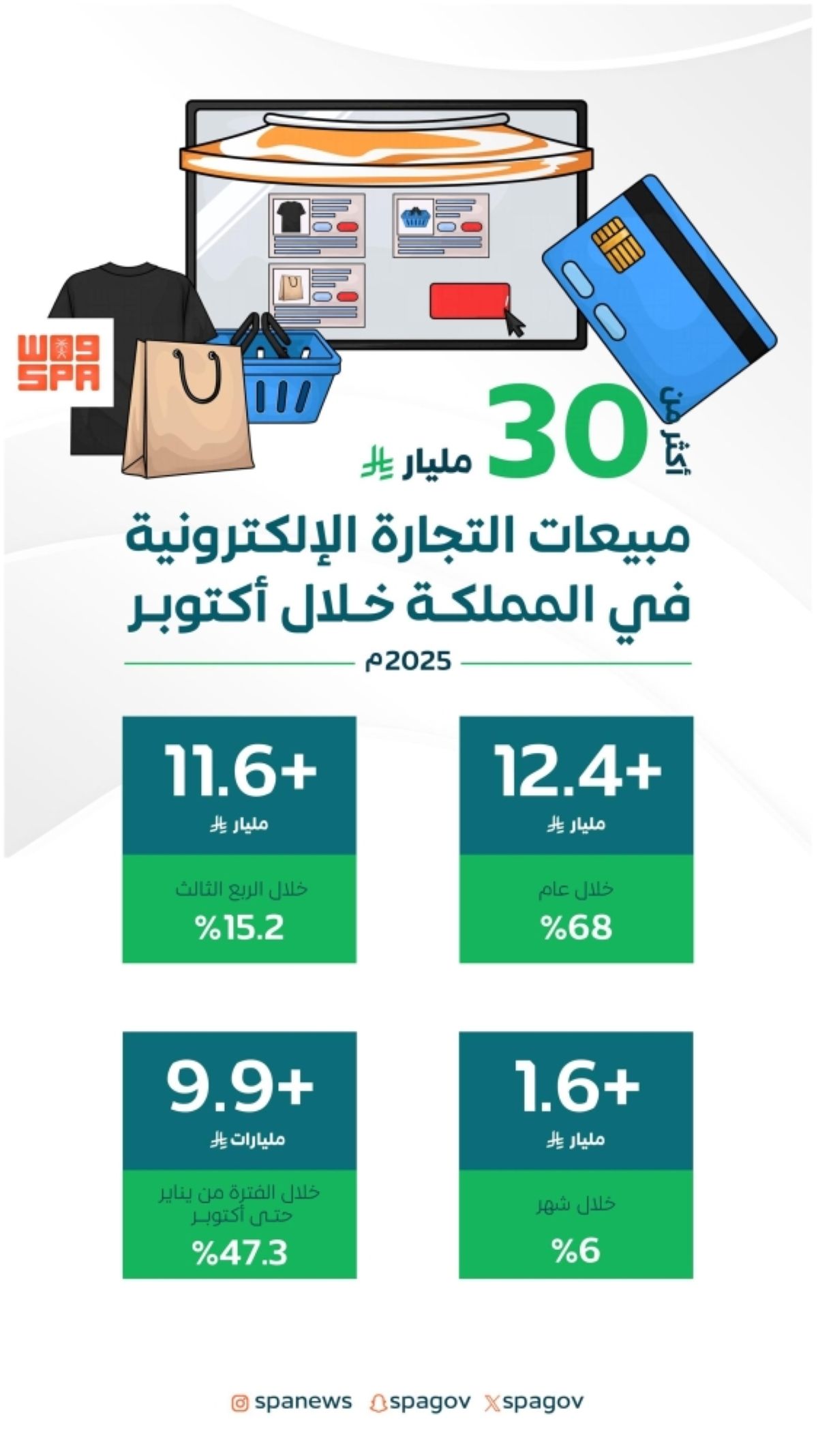 +30 مليار ريال مبيعات التجارة الالكترونية بالمملكة في أكتوبر, اليوم الأحد 28 ديسمبر 2025 11:37 مساءً