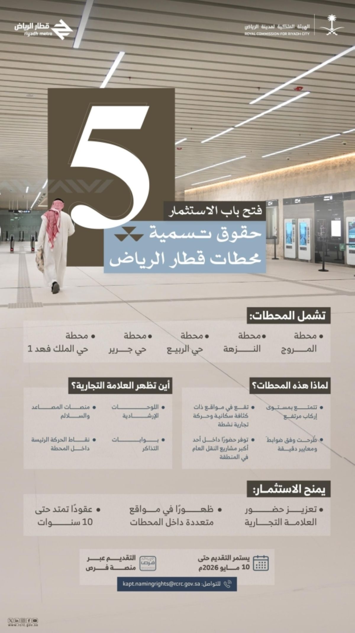 وتدعو الجهات المنظمة المستثمرين والمؤسسات المالية والمشغلين المحليين والدوليين إلى الاطلاع على وثيقة طلب إبداء الرغبات التي تحتوي على معلومات المشروع من خلال زيارة الموقع الالكتـروني للمركز الوطني للتخصيص www.ncp.gov.sa، علما بأن آخر موعد لتقديم طلبات إبداء الرغبة هو 26 أبريل، 2026م، في تمام الساعة 11:59 مساء بتوقيت السعودية.