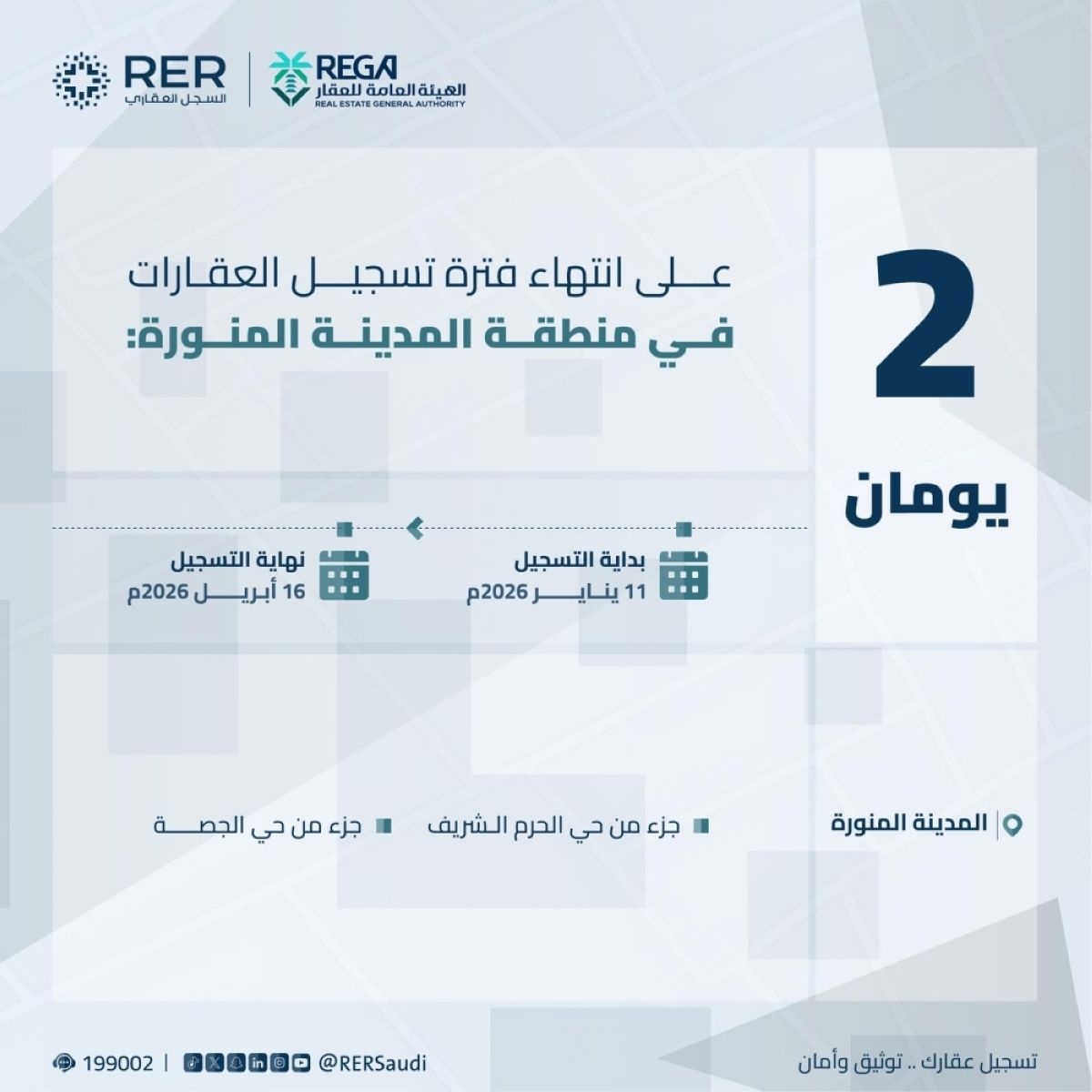 ودعت الهيئة ملاك العقارات الواقعة ضمن نطاق الأحياء إلى سرعة المبادرة بتسجيل عقاراتهم من خلال منصة السجل العقاري rer.sa قبل انتهاء مدة التسجيل للاستفادة من خدمات تنفيذ التصرفات العقارية وتوثيق جميع التغييرات التي تطرأ على العقار.