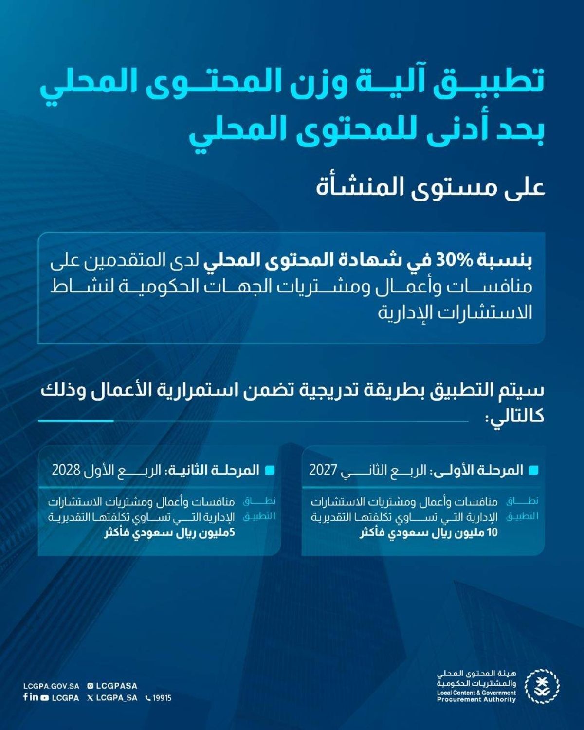 وأوضحت الهيئة أنه سيتم اشتراط حد أدنى للمحتوى المحلي على مستوى المنشأة بنسبة (30%) على منافسات الاستشارات الإداريةعلى مرحلتين؛ تبدأ اعتباراُ من 1 أبريل 2027 على المنافسات التي تبلغ تكلفتها التقديرية (10 مليون ريال سعودي) فأكثر، على أن يشمل لاحقًا المنافسات التي تبلغ (5 مليون ريال سعودي) فأكثر ابتداءً من 1 يناير 2028.