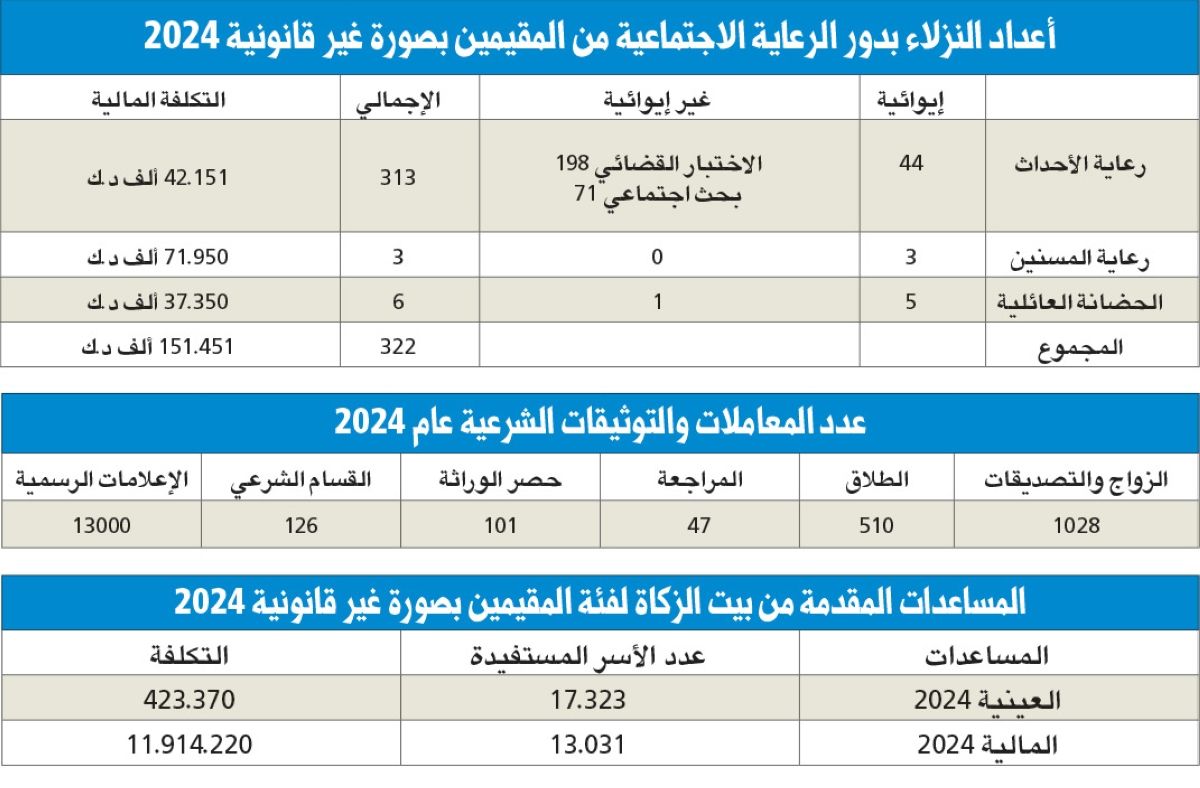 وقد بلغ عدد الطلبات المقدمة للجنة دعاوى النسب وتصحيح الأسماء لفئة المقيمين بصورة غير قانونية عام 2024 نحو 109، وبلغ عدد المسجلين لدى المؤسسة العامة للتأمينات الاجتماعية كأصحاب أنصبة ومعاشات 1195، وبلغ العدد الإجمالي لأصحاب المعاشات من تلك الفئة 383، فضلاً عن 13 شخصاً خُصصت لهم وحدات سكنية لدى المؤسسة العامة للرعاية السكنية.