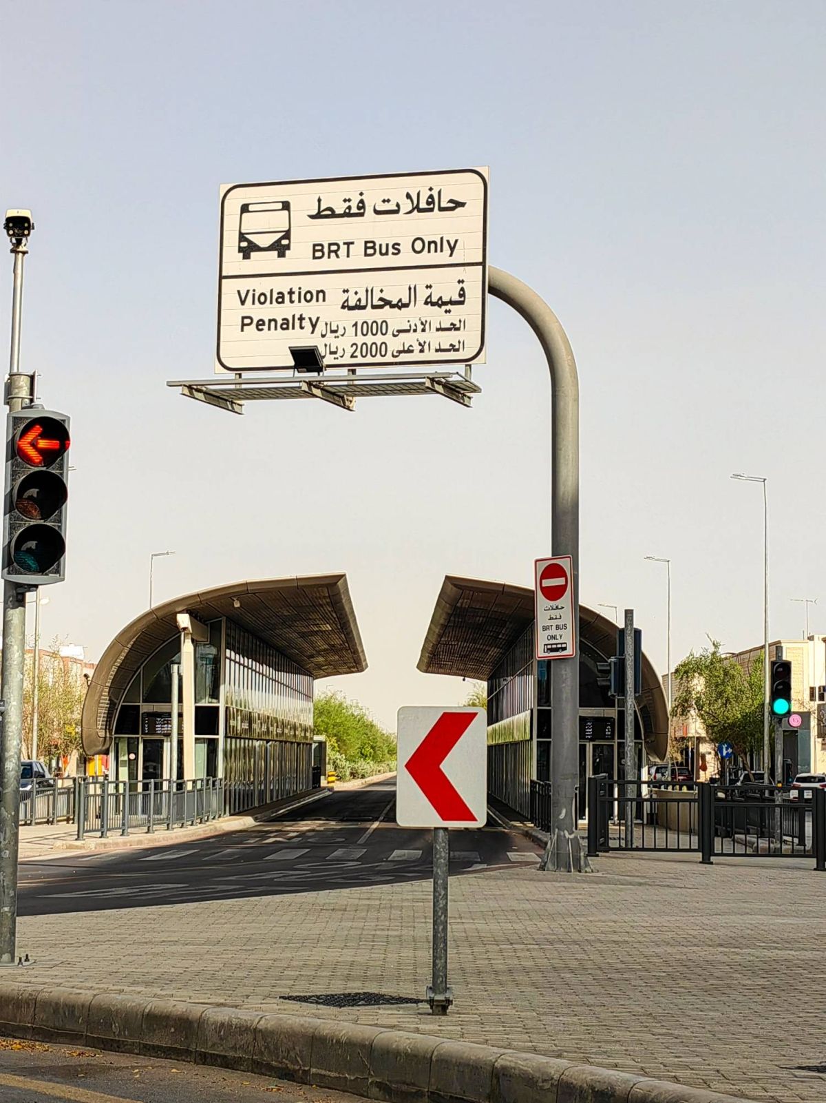 حذرت الجهات المختصة من مخالفة بقيمة 2000 ريال للحد الأعلى و1000 ريال للحد الأدنى، لكل من يتعدى على مسار حافلات الرياض في الطرق المخصص لها، كنوع من الالتزام وردع المخالفين. (أنس الحارثي)
